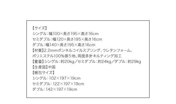 2.2mmボンネルコイルスプリング(コイル数:S288個、SD352個、D416個)、ウレタンフォーム、ポリエステル100%張り地、両面多針キルティング加工