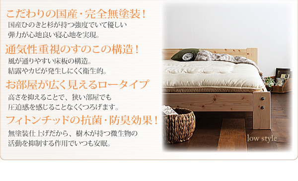 ・国産ひのきと杉が持つ強度でいて優しい弾力が心地良い寝心地を実現。