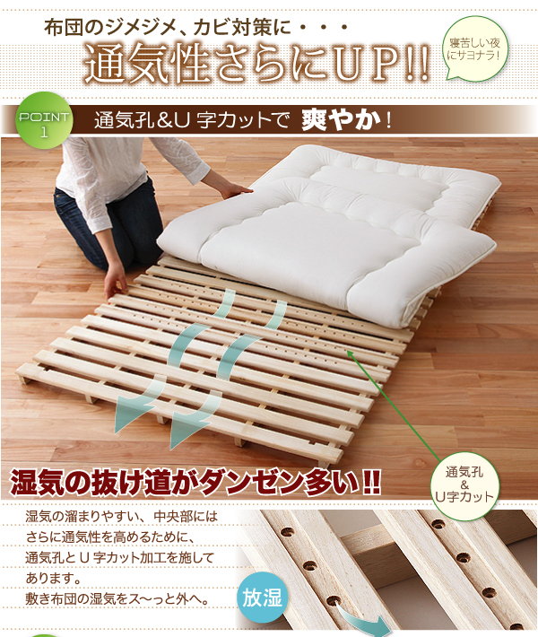 ・・湿気の溜まりやすい、中央部にはさらに通気性を高めるために、通気孔とU字カット加工を施してあります。敷き布団の湿気をス〜っと外へ。
