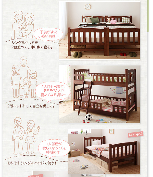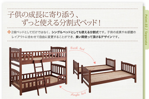 2段ベッドとしてだけではなく、シングルベッドとしても使える分割式です。子供の成長やお部屋のレイアウトに合わせて自由に変更することができ、長い間使って頂けるデザインです。
