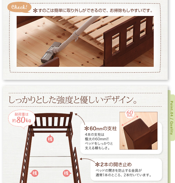 ファインは高さを低めに設定することで、みんなに優しいベッドになりました!全体の高さは153cm。子供でも安心して上ることができます。また、子供がベッドの上に登っても目線が合う高さで会話も弾みます!布団の上げ下ろしも楽にできてお母さんにも嬉しいベッドです!