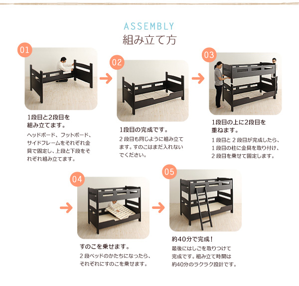 ヘッドボード、フットボード、サイドフレームをそれぞれ金具で固定し、上段と下段をそれぞれ組み立てます。