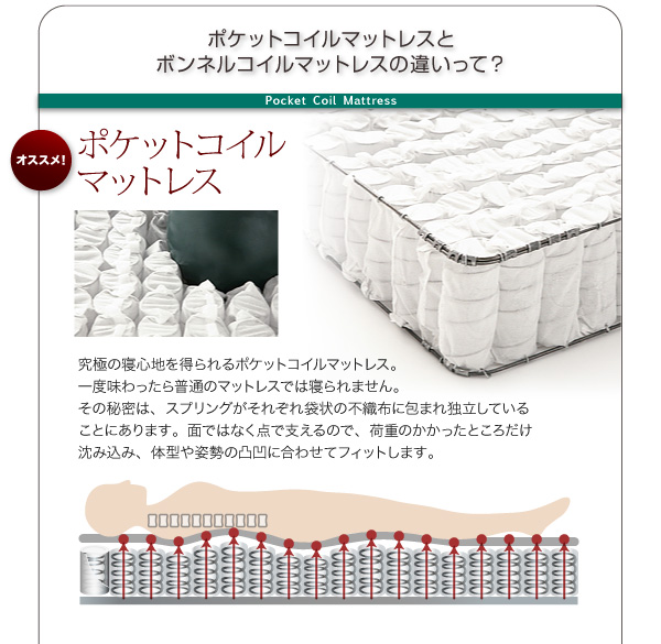 究極の寝心地を得られるポケットコイルマットレス。一度味わったら普通のマットレスはでは寝られません。その秘密は、スプリングがそれぞれ袋状の不織布に包まれ独立しているので、荷重のかかった場所だけが沈み込む構造だから。面ではなく点で支えるので、荷重のかかったところだけ沈み込み、体型や姿勢の凸凹に合わせてフィットします。
