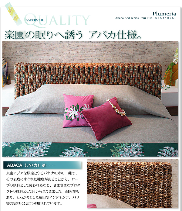 プルメリアは脚付きタイプのアバカベッド。サイドを縁取られたアバカにベッド全体が包まれたお部屋を優しい雰囲気にするデザインです。