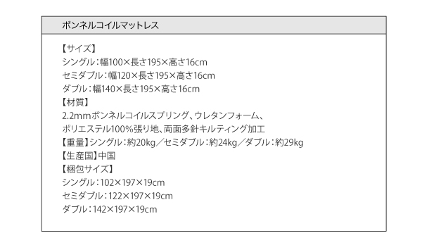 【重量】シングル約29kg、セミダブル約33.5kg、ダブル約36kg、クィーン約39.5kg
