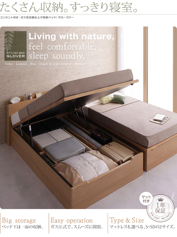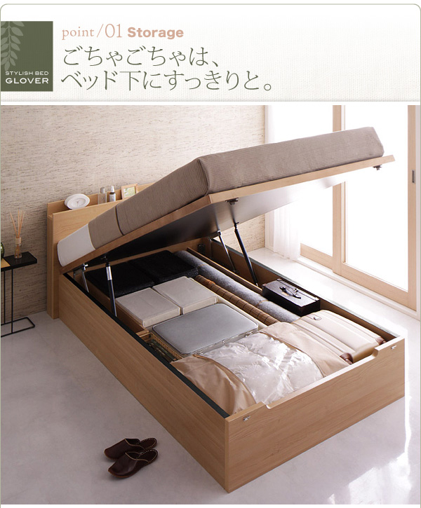 one point:引出し2杯の収納ベッドと比べて、省スペースなのに、収納スペースは倍以上!!引出し収納の場合、引き出すスペースが必要となりますが、リフトアップベッドなら、そのスペースも必要なし。