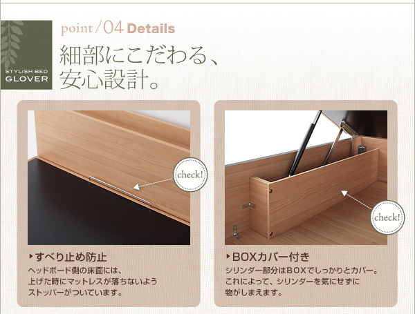 ・すべり止め防止/ヘッドボード側の床面には、上げた時にマットレスが落ちないようストッパーがついています。