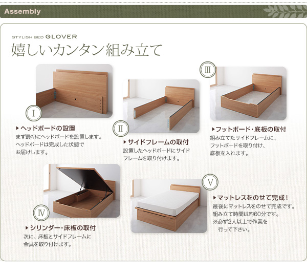 最後にマットレスをのせて完成です。組み立て時間は約60分です。※必ず2人以上で作業を行って下さい。