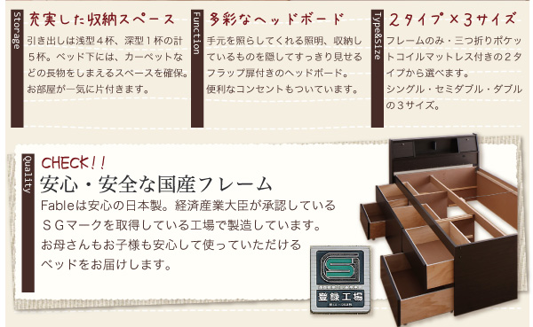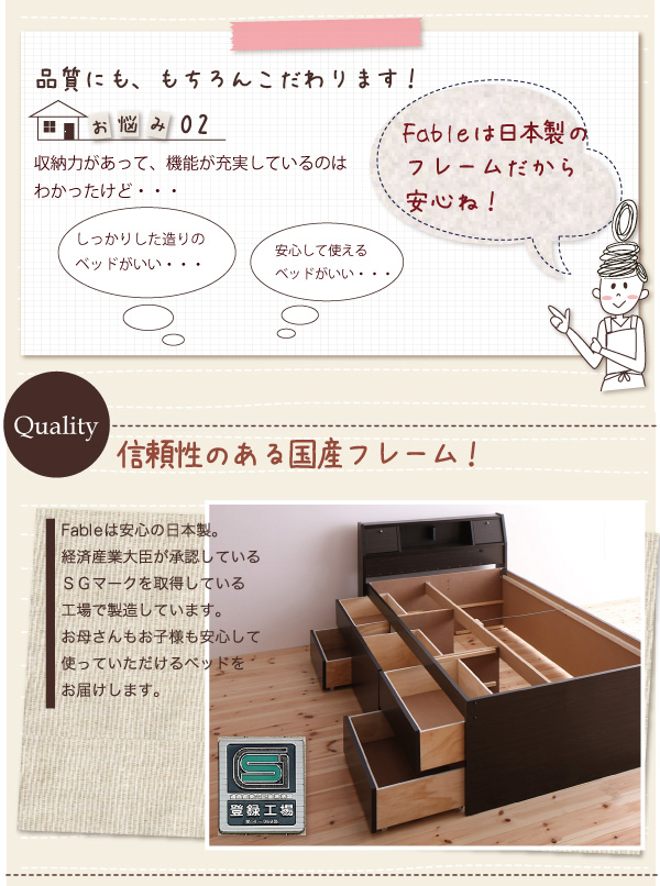 ファーブルは安心の日本製。経済産業大臣が承認しているSGマークを取得している工場で製造しています。お母さんもお子様も安心して使って頂けるベッドをお届します。