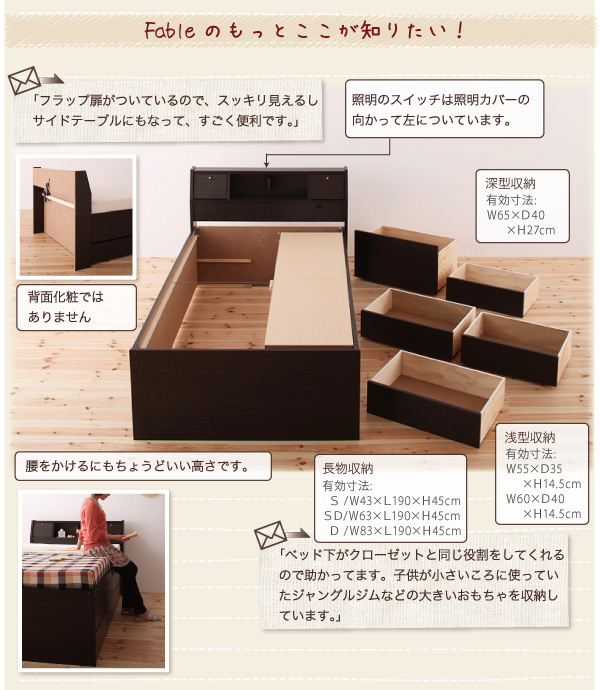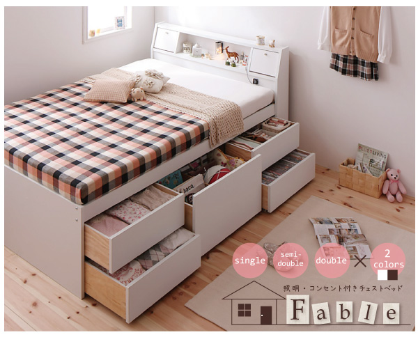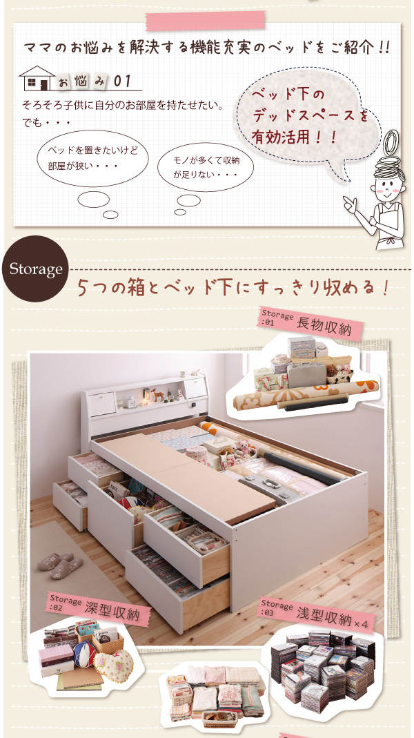 引出しは浅型4杯、深型1杯の計5杯。ベッド下には、カーペットなどの長物をしまえるスペースを確保。お部屋が一気に片付きます。