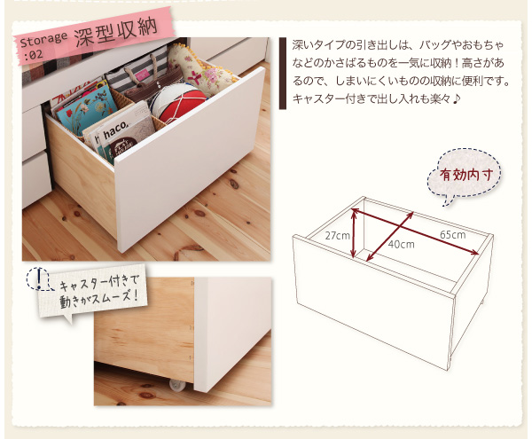 深いタイプの引き出しは、バッグやおもちゃなどのかさばるものを一気に収納!高さがあるので、しまいにくいものの収納に便利です。キャスター付きで出し入れも楽々♪
