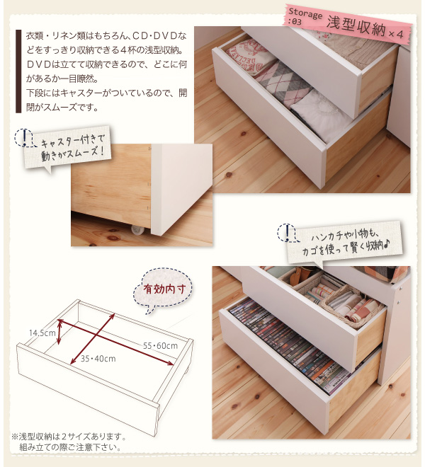 衣類・リネン類はもちろん、CD・DVDなどをすっきり収納できる4杯の浅型収納。DVDは立てて収納できるので、どこに何があるか一目瞭然。下段にはキャスターがついているので、開閉がスムーズです。