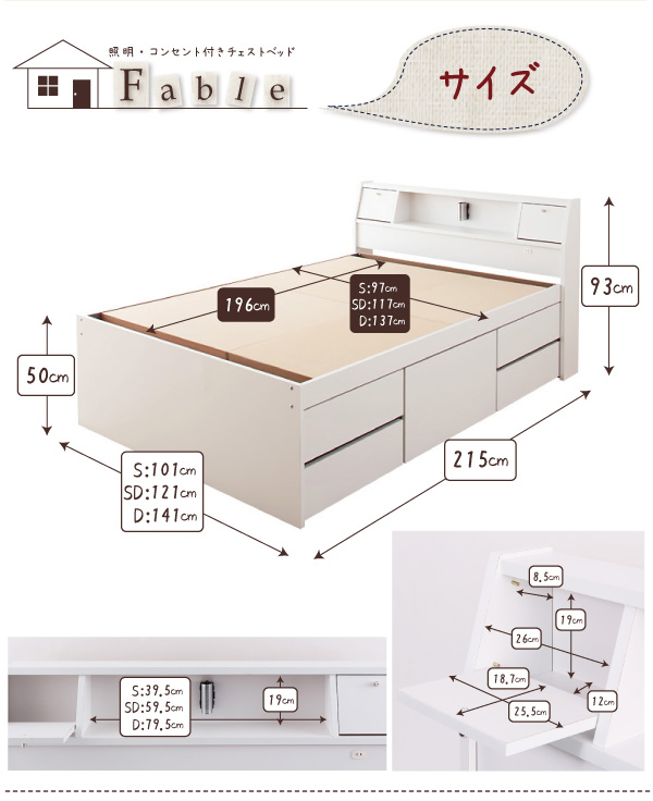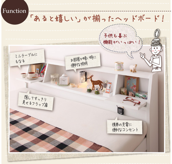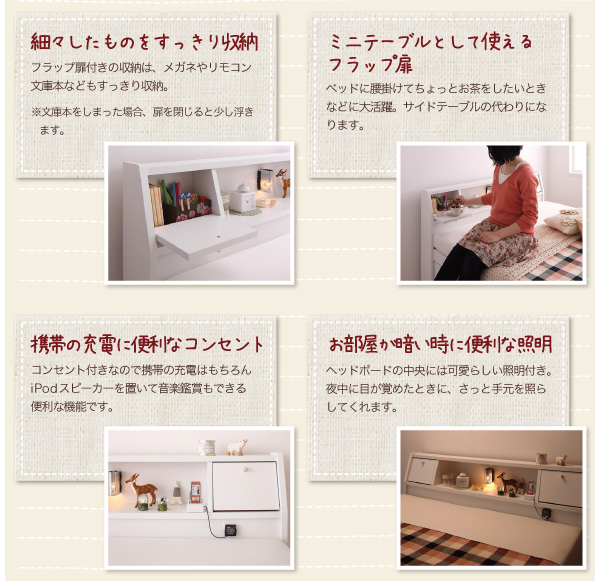 手元を照らしてくれる照明、収納しているものを隠してすっきり見せるフラップ扉付きのヘッドボード。便利なコンセントもついています。