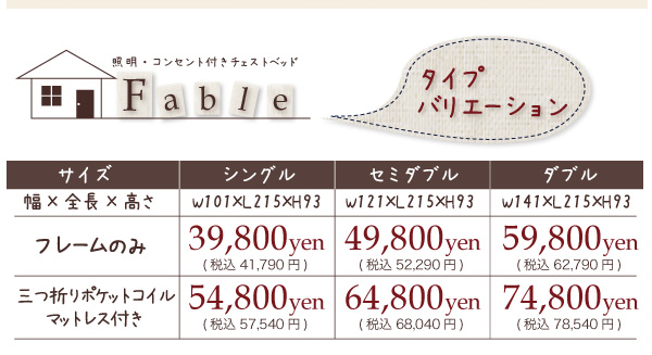 シングル:39800円(税込41790)、セミダブル:49800円(税込52290)、ダブル:59800円(税62790)