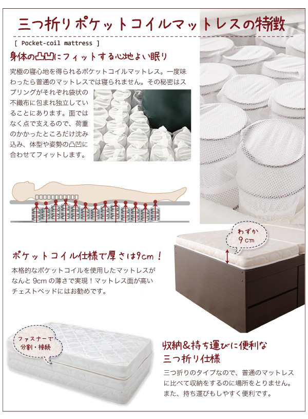 本格的なポケットコイルを使用したマットレスがなんと9cmの薄さで実現!マットレス面が高いチェストベッドにはおススメです。
