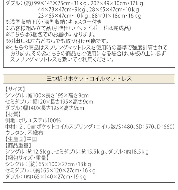 【商品重量】シングル:約77kg、セミダブル:約82kg、ダブル:約87kg
