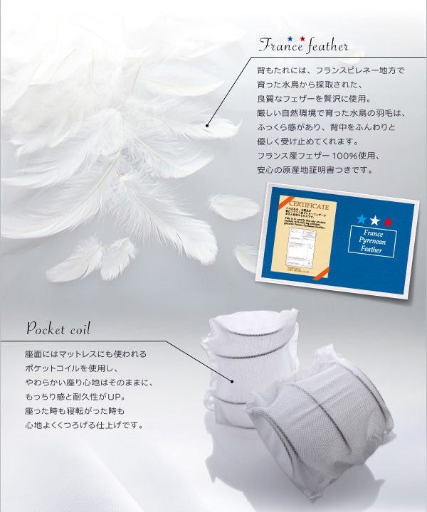 背もたれには、フランスピレネー地方で育った水鳥から採取された、良質なフェザーを贅沢に使用。厳しい自然環境で育った水鳥の羽毛は、ふっくら感があり、背中をふんわりと優しく受け止めてくれます。フランス産フェザー100%使用、安心の原産地証明書つきです。