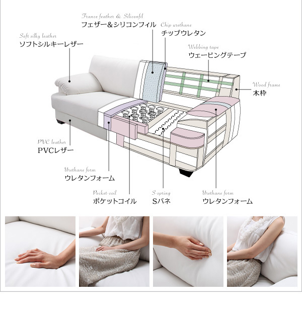 座面にはマットレスにも使われるポケットコイルを使用し、やわらかい座り心地はそのままに、もっちり感と耐久性がUP。座った時も寝転がった時も心地よくくつろげる仕上げです。