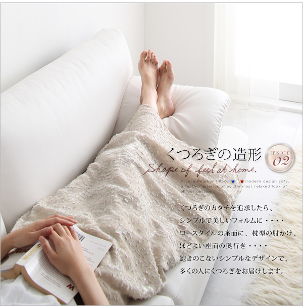 フランスフェザーのやわらかな感触・・・それは座ったものにしかわからない、優しく包み込むようなそっと寄り添うような不思議な感覚・・・座った瞬間、幸せに満ちてくる、そんな心地よさ。