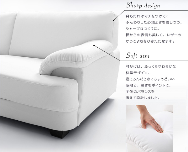 肘かけは、ふっくらやわらかな枕型デザイン。寝ころんだときにちょうどいい感触と、高さをポイントに、全体のバランスを考えて設計しました。