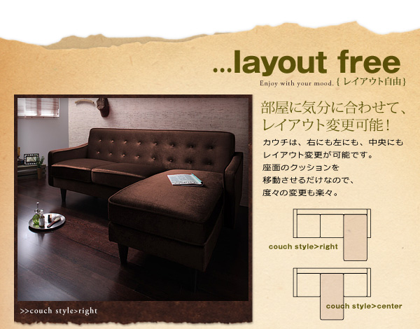 カウチは、右にも左にも、中央にもレイアウト変更が可能です。座面のクッションを移動させるだけなので、度々の変更も楽々。