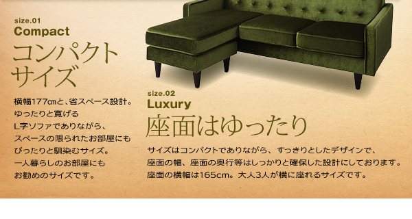 横幅177と、省スペース設計。ゆったりと寛げるL字ソファでありながら、スペースの限られたお部屋にもぴったりと馴染むサイズ。一人暮らしのお部屋にもお勧めのサイズです。