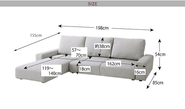 幅 198(座面幅162cm) 奥行き85cm-155cm(座面奥行き70cm-140)