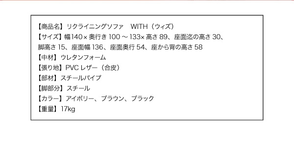 幅140×奥行き100〜133×高さ89、座面迄の高さ30、脚高さ15、座面幅136、座面奥行54、座から背の高さ58