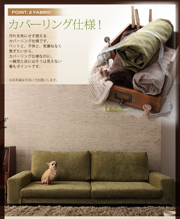 汚れを気にせず使えるカバーリング仕様です。ペットと、子供と、気兼ねなく寛ぎたいから。カバーリング仕様なのに、一瞬見た目にはそうは見えない事もポイントです。