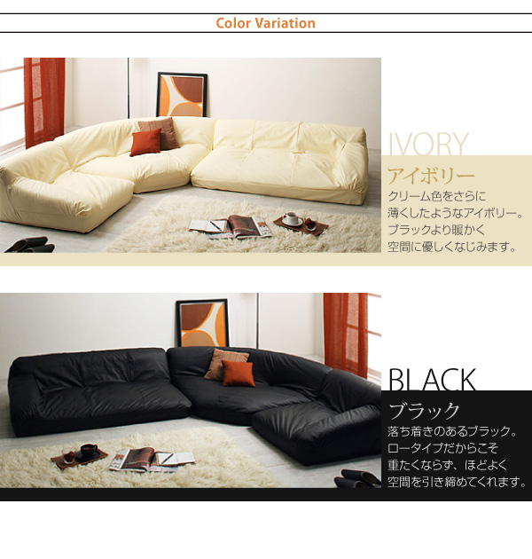 床でくつろぐようなリラックス感がフロアソファの人気の秘密。また、狭い部屋にもゆったりとした空間が生まれます。1人掛け、コーナー、2人掛けの3点セットで、2パターンご用意。間取りに合わせて、左コーナーセットor右コーナーセットからお選び頂けます。