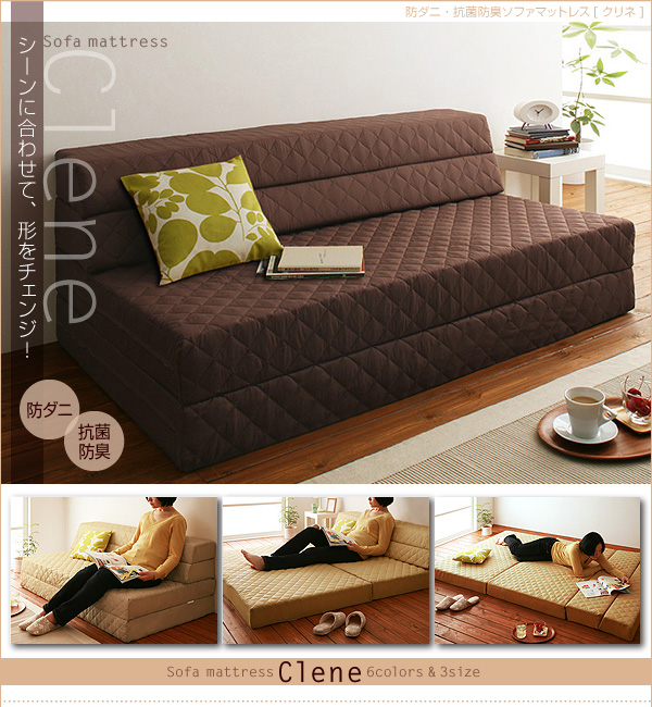 使い方に合わせて自由自在に変化!全部広げるとしっかりとしたマットレス、折りたためばソファとして、脚をのばせるカウチスタイルに。これだったらベッドとソファが一台ですみます!昼はソファとしてくつろぎ、夜はマットレスとして使用してスペースを有効活用!急な来客にもベッドとして重宝しそう♪