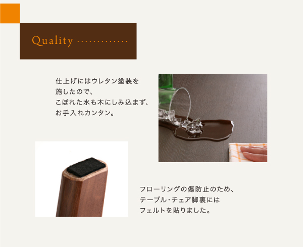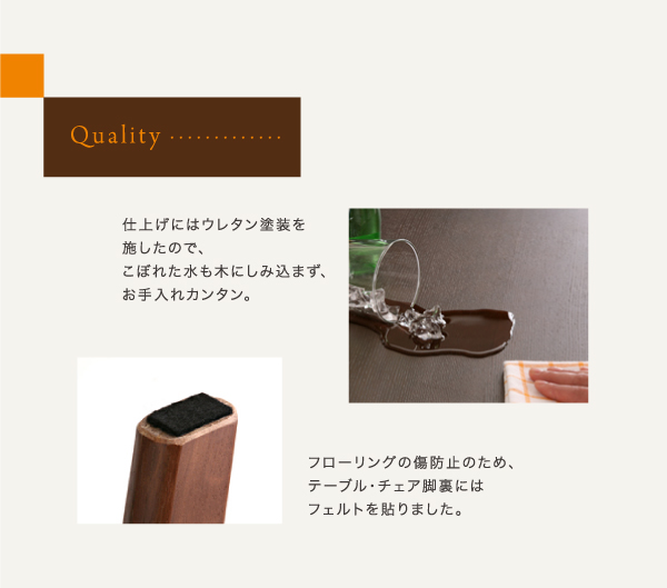 こぼれた水も木にしみ込まず、お手入れカンタン。
