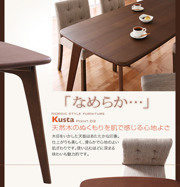 木目をいかした天板はあたたかな印象。仕上がりも美しく、滑らかで心地のよい肌ざわりです。使い込むほどに深まる味わいも魅力的です。