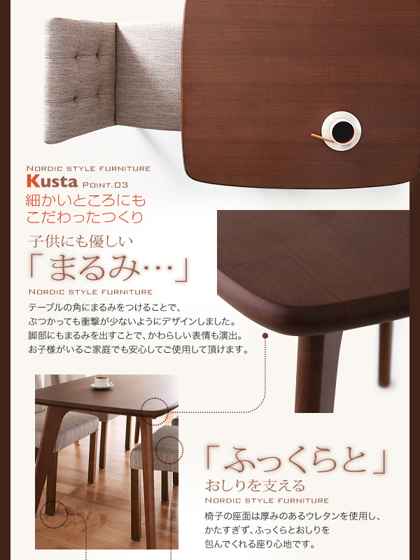 ぬくもりある手触りのファブリック張りチェア。なんだかほっとする、心地のいい北欧スタイルの空間が広がります。木のぬくもりとかわいらしいデザインでいつもより食事がおいしく感じられそう。