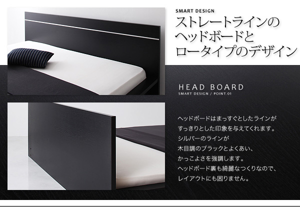 HEAD BORD:ヘッドボードはまっすぐとしたラインがすっきりとした印象を与えてくれます。シルバーのラインが木目調のブラックをよくあい、かっこよさを強調します。ヘッドボード裏も綺麗なつくりなので、レイアウトにも困りません。