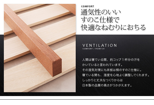 人間は寝いてる間、約コップ1杯分の汗をかいていると言われています。その湿気対策にも床板は桐のすのこ仕様に。寝ている間も、湿度を心地よく調整してくれます。しっかりと丈夫なつくりからは日本製の品質の高さがうかがえます。