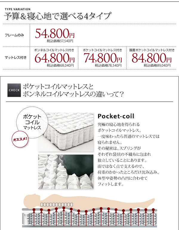 ポケットコイルマットレス付き:74800円(78540円)