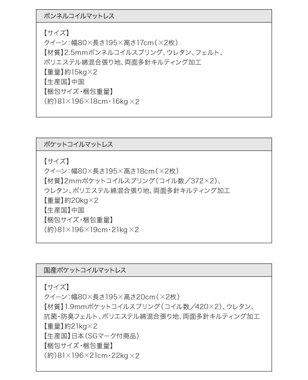 マットレス面までの高さ:21.5cm(ボンネルコイルマットレス)/22.5cm(ポケットコイルマットレス)/24.5cm(国産ポケットコイルまっとれうS)