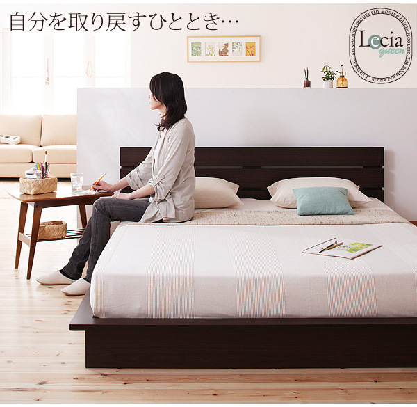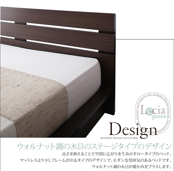 高さを抑えることで空間に広がりを生み出すロータイプのベッド。マットレスより少しフレームが出るタイプのデザインで、モダンな雰囲気のあるベッドです。ウォルナット調の木目が暖かみをプラスします。