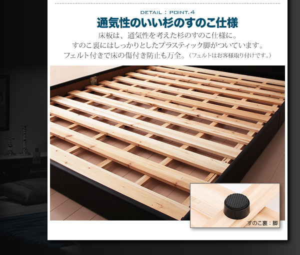 床板は、通気性を考えた杉のすのこ仕様に。すのこ裏にはしっかりとしたプラスティック脚がついています。フェルト付きで床の傷付け防止も万全。(フェルトはお客様取り付けです。)