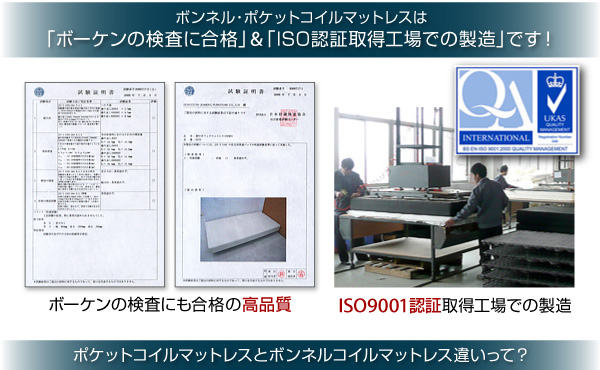 ボンネルコイル、ポケットコイルマットレスは、ISO9001認証取得工場で製造しています!マットレスの製造は、ISO9001認証取得工場で行っています。国際規格認定の品質で、「安心」と「信頼」をお届けします。