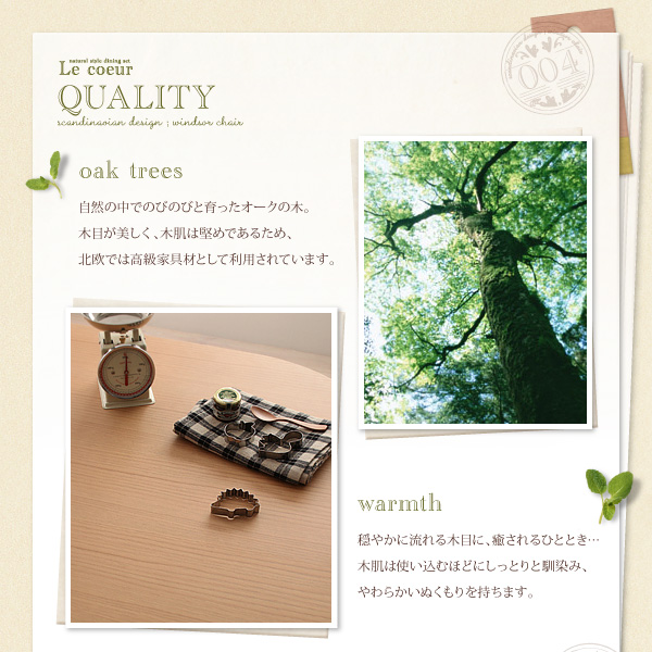 自然の中でのびのびと育ったオークの木。木目が美しく、木肌は堅めであるため、北欧では高級家具材として利用されています。
