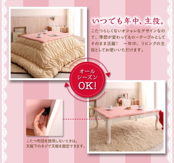 まるでこたつとは思えない、ロマンティックなヨーロピアン調デザイン。お部屋に置くだけで、大人かわいいスウィート空間の出来上がり。