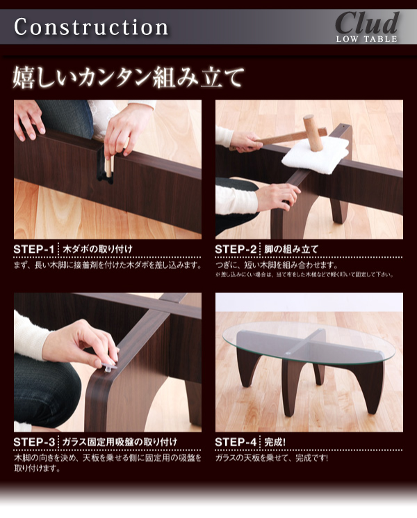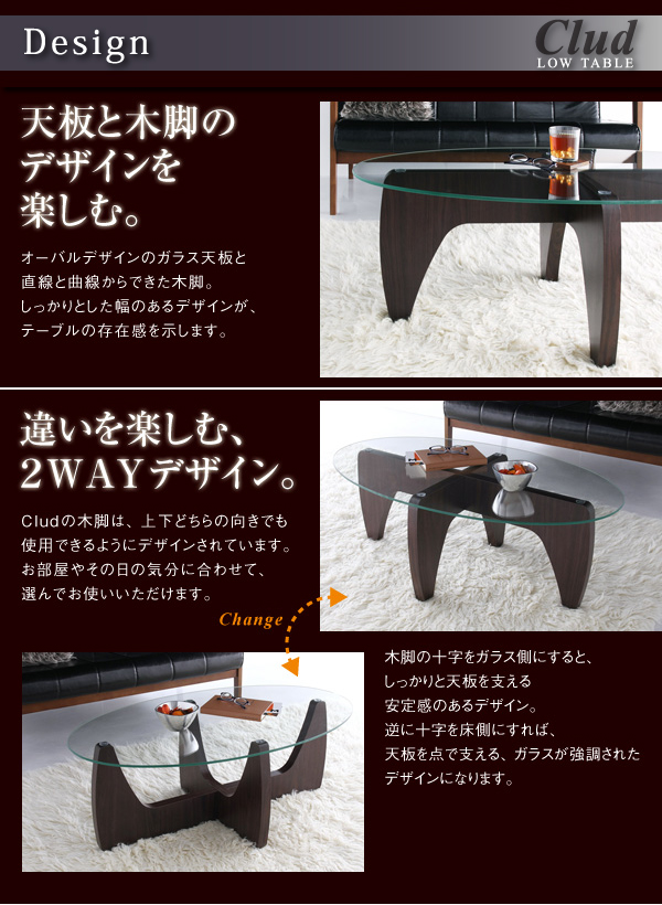木脚の十字をガラス側にすると、しっかりと天板を支える安定感のあるデザイン。逆に十字を床側にすると、天板を点で支える、ガラスが強調されたデザインになります。