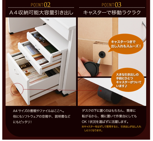 ・・デスクの下に置くのはもちろん、簡単に転がるから、横に置いて作業台にしてもOK!状況を選ばずに活躍します。