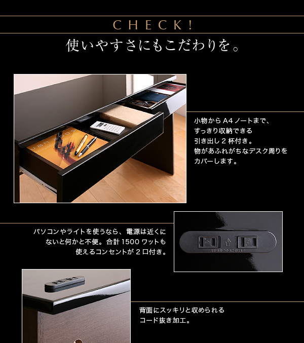 ・小物からA4ノートまで、すっきり収納できる引き出し2杯付き。物があふれがちなデスク周りをカバーします。