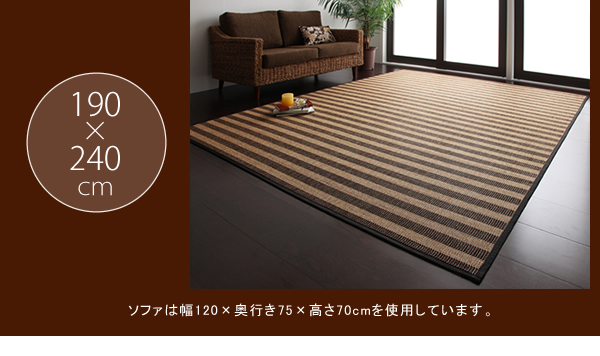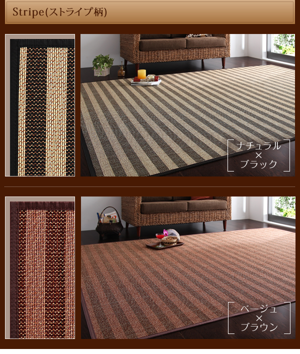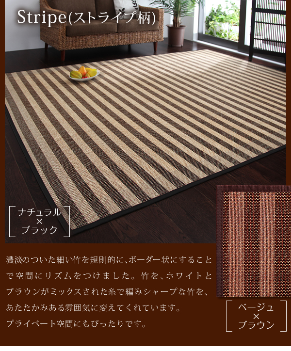落ち着きのある濃い竹の色と、爽やかな横糸のコントラストがリゾート気分を盛り上げてくれるデザインです。