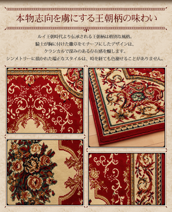 味わい深い重厚感のあるデザイン。モチーフを美しく表現する色の鮮明さが深さを生みます。飽きのこないデザインを鮮明に表現するためにウィルトン織りを採用しました。