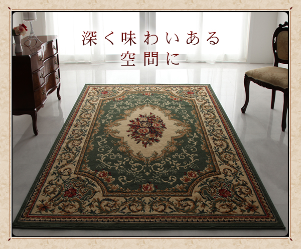 オリエンタルで落ち着きある色調が豊かに広がるラグは、深みのある表情を見せます。独特の味わいのある世界を、あなたに。
