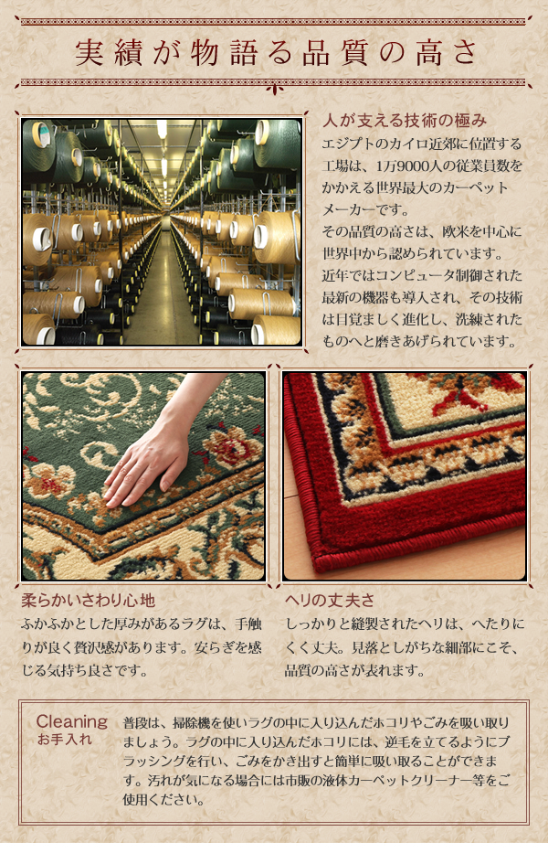 古代文明が花開いた地、エジプト。技術の発展が目覚ましいこの地は、世界3大カーペット生産国の1つでもあります。歴史が息づくエジプト製の特別な逸品を、あなたのお部屋にお届けします。